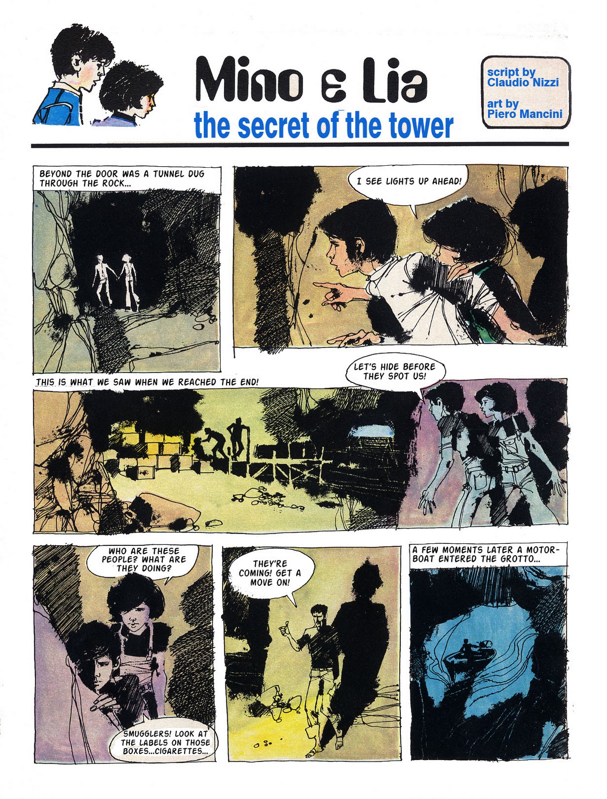 Following is one of Mancini's Mino and Lia adventures. Though only 9 pages long it was split across two issues of Il Messaggero. In fact I think it was originally intended to run in three parts. In the Italian original the last panel on page 3 seemed to set up a cliffhanger and the first row of panels on page 4 look like they were extended upward to cover a gap left for the series logo.